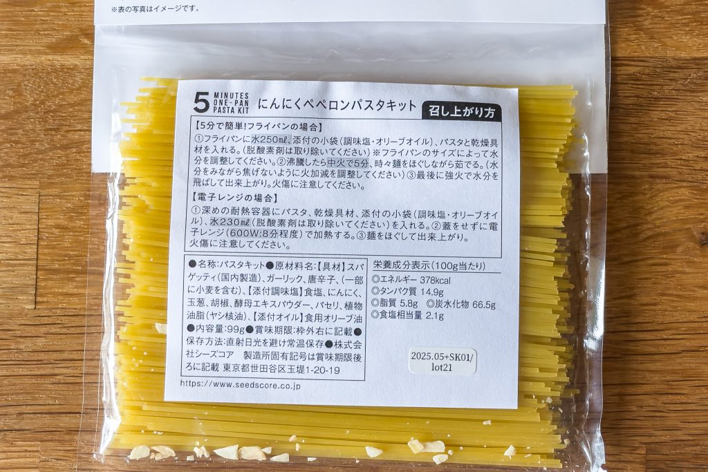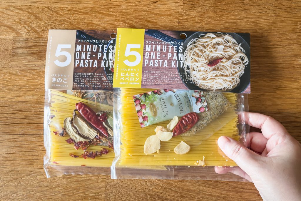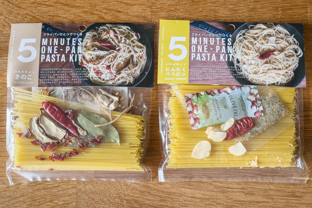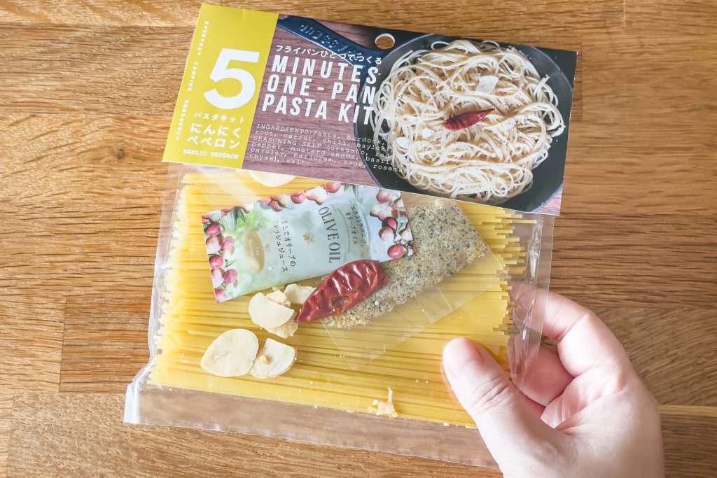こちらが今回ご紹介する「パスタキット」。短めのバスタにスパイスやオイル、具材がセットになっています。