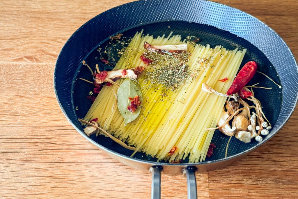 フライパンに分量の水と添付の小袋(調味塩やオイル)、パスタと乾燥具材を入れ(脱酸素剤をは抜いてください)、ときどき麺をほぐしながら茹でます。