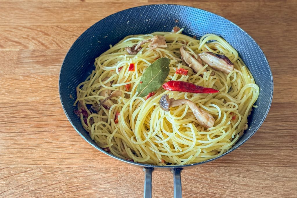 調理は写真のような小さめのフライパンでOK。パスタが短いのでメスティンでも作れると思います◎
